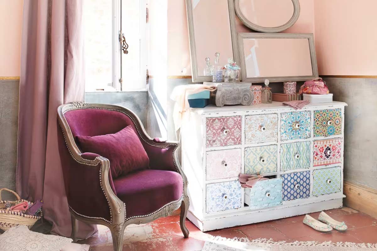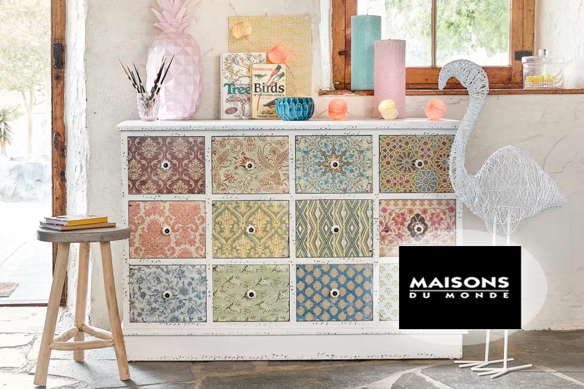 Il mobiletto bianco sporco a 12 cassetti di Maisons du Monde in saldo risolve con colore e carattere il classico problema del salotto spento. L’effetto patchwork, insieme alla patina anticata, cambia subito l’atmosfera anche se l’arredo è basico.